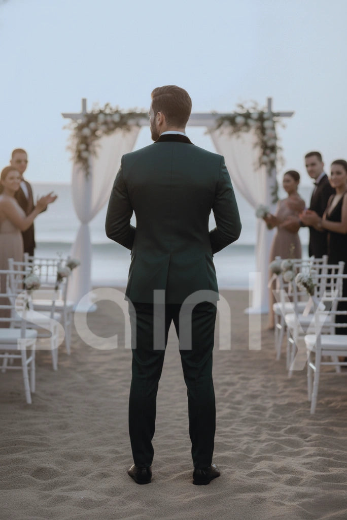 This men’s green 3-piece slim fit suit is designed for a sleek and modern formal statement. Featuring a sharp one-button closure with tuxedo-inspired detailing, it offers a clean, structured silhouette. Perfect for weddings, groom wear, and special occasions, this bespoke-style suit combines bold color with refined elegance.